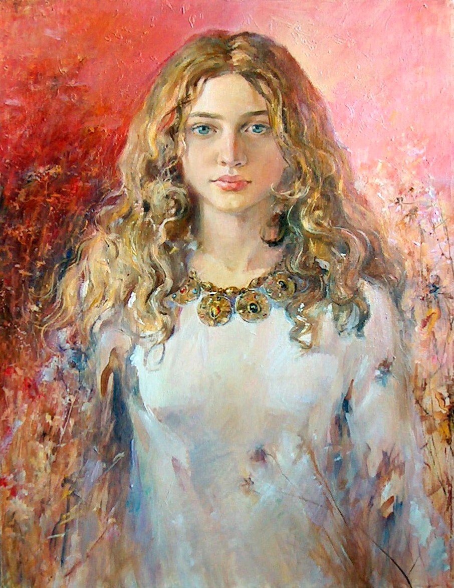 Однажды по дороге на работу я увидела девушку с поразительно пышными волосами и с характерной славянской внешностью. Я подошла к ней и предложила написать ее портрет. Это был единственный подобный случай. В итоге родился образ, который я назвала Ярослава — дань моему увлечению историей древней Руси.