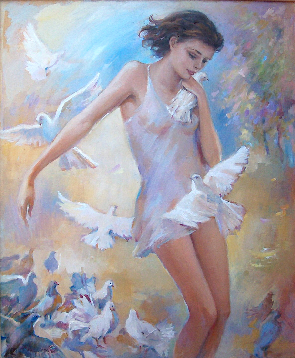 Как ни странно, но эта романтическая картина с девушкой в прозрачном платьице и голубями была приобретена очень прагматическим человеком, бизнесменом, а ныне — главой районной администрации. Сегодня эта работа кажется мне немного наивной, картиной из моего «голубого периода», но многим она нравится, и эти многие — и женщины, и мужчины.