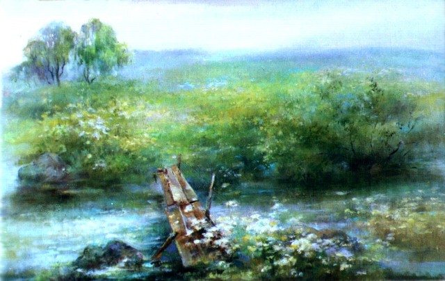 Из моих старых работ мне сегодня мало что нравится, но этот полуразрушенный, старенький мостик через ручей, за которым — разноцветье трав, цветы, очаровывает и сегодня. Мостик есть, но пройти по нему уже нельзя… место, где ты был, но куда не вернуться.