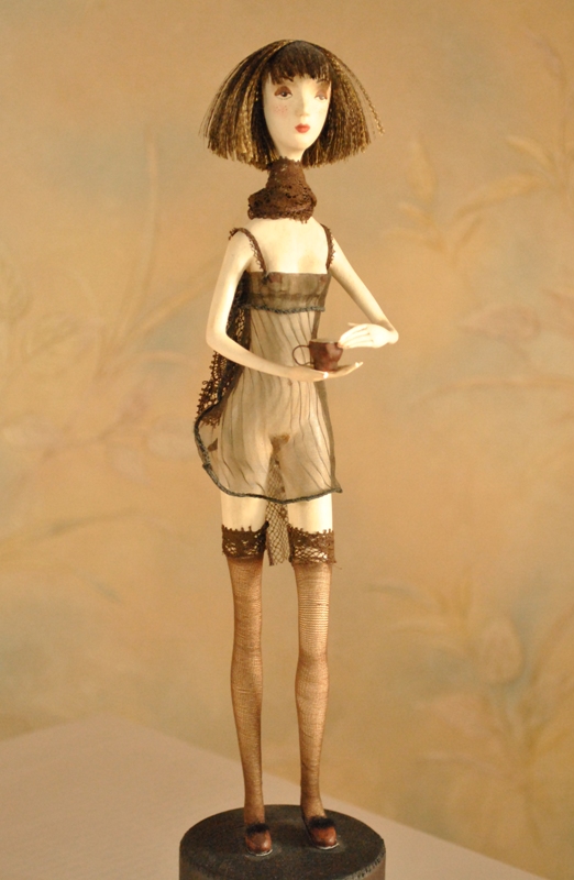Сонная и полураздетая, очаровательная и забавная — такой стала одна из первых моих кукол. Она одета в прозрачную «ночнушку» и без трусиков. Не судите строго — все-таки мое первое детище. Говорят, что она похожа на персонажа мультфильма — не спорю, но только это мультфильм для взрослых. Я назвала эту работу «утренний кофе», хотя можно было бы назвать и «утром парижанки», «утром после бурной ночи», но я все-таки выбрала первый вариант.
