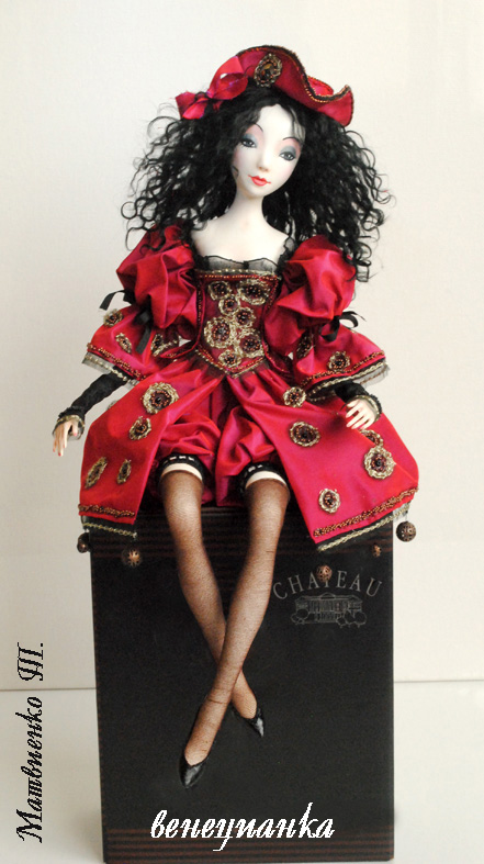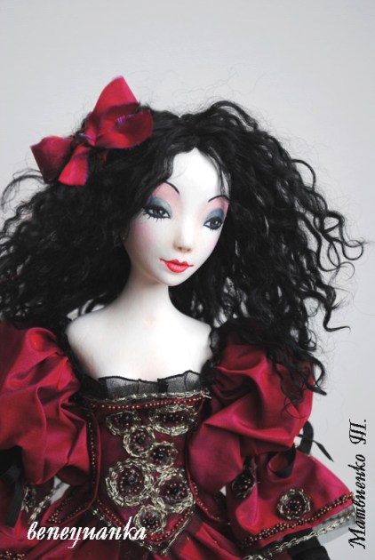 Я работала над ней около месяца, и мне пришлось приложить немало сил, чтобы изучить декорирование тканей, историю костюма, чтобы моя любимица получилась не только нарядной, изящной, но и «девушкой с огоньком», вызывающей не только женский интерес, но и мужское желание 🙂