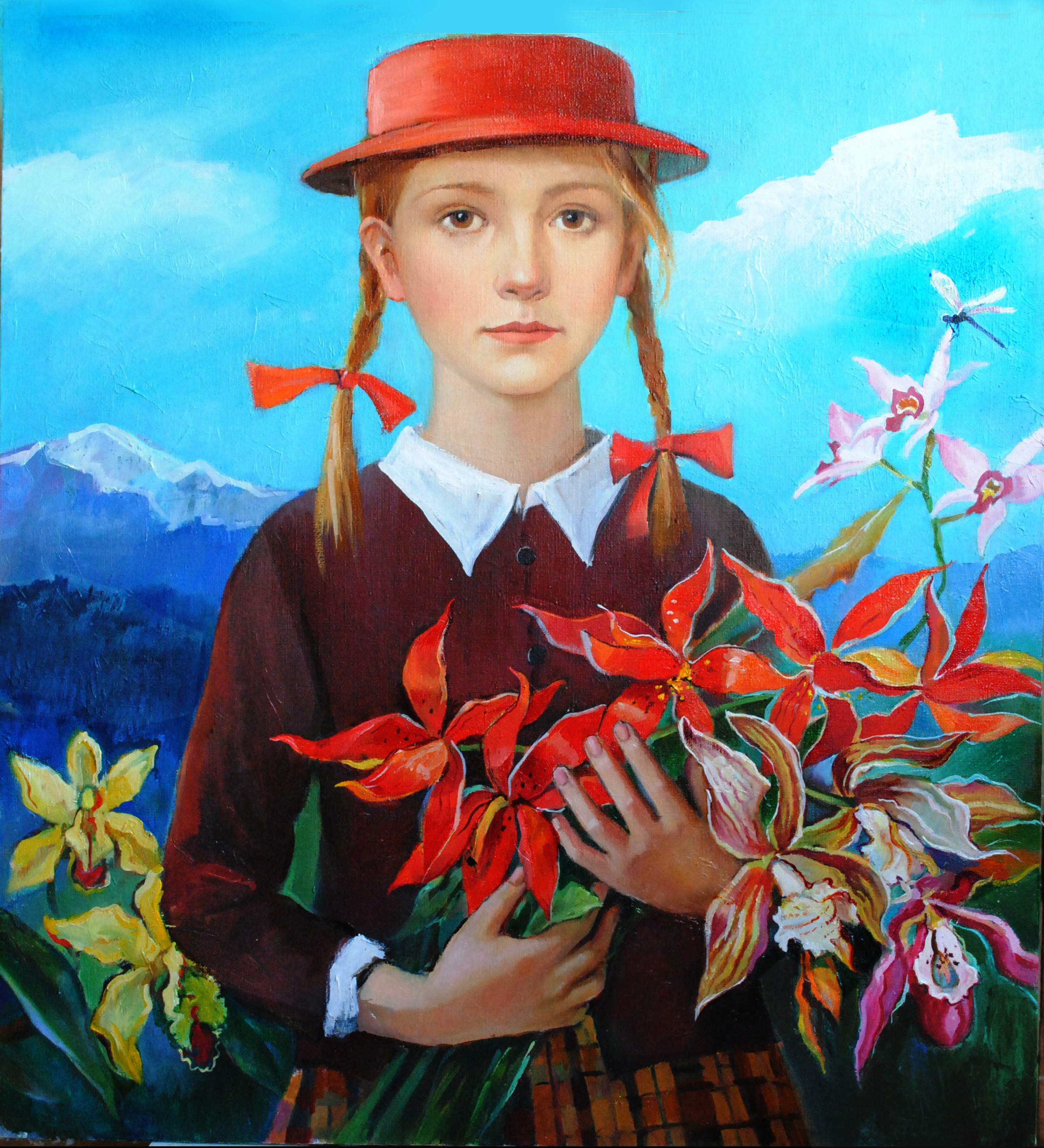 Над этой картиной я начала работать еще в 2003, но закончила лишь недавно. Она отличается от большинства моих работ, наверное, из-за своего «психоделического» характера. Эта девочка в странной шляпке и юбочке школьницы, с букетом орхидей, изображенная на фоне гор. Здесь все подчеркнуто красиво, идеально. И в то же время в ней есть то, что заставило меня вернуться к этой картине даже спустя много лет — свежесть, невинность бытия… В этой работе нет технических ухищрений или новых форм, но в ней есть то, что, пожалуй, дается художнику труднее всего — чувство иного времени. Дитя грез — это пришелец либо из далекого прошлого, либо — из будущего…