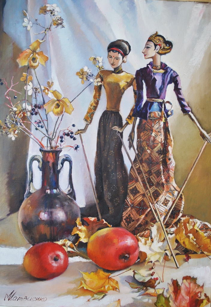 Кукол, которые вдохновили меня на эту работу — а это куклы из индонезийского театра марионеток, я увидела в Амстердаме на блошином рынке — и не устояла перед их экзотической, и в то же время неброской, красотой.