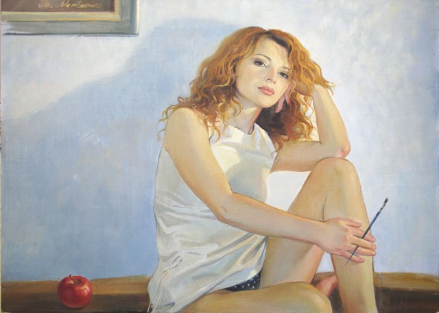 Эта работа выполнена мной в начале марта 2010 года. Холст, масло. Картина победила на тогдашней городской выставке-конкурсе женского портрета. Местная пресса, такая скупая на похвалу, на этот раз расщедрилась на несколько одобрительных слов, хотя и назвала картину «портретом художныци у спидньому».