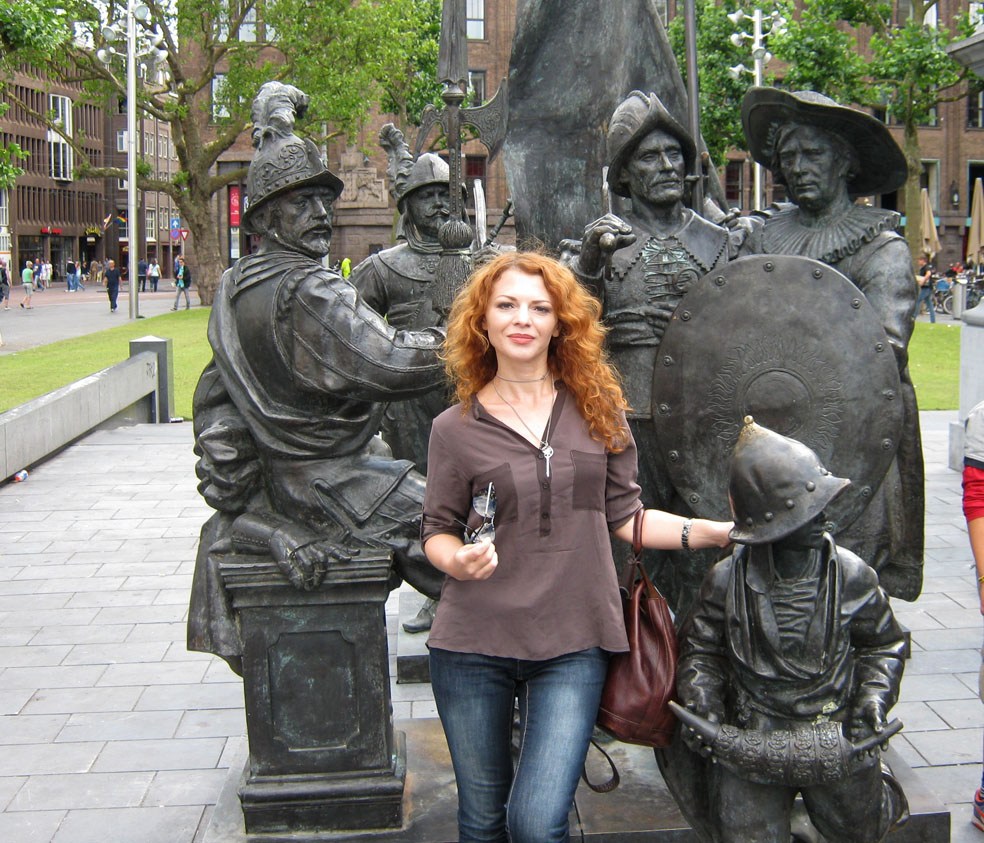 Этой компании бронзовых мушкетеров, будто сошедших со знаменитой картины «Ночной дозора» Рембрандта явно не хватает женщины — судя по их взглядам, и несмотря на их возраст и забронзовелость, даже они оживились, когда я, исхудавшая на голландской диете (немножко сыра и много движения!) уделила им внимание. Ничего, мне не жалко — им тут еще долго стоять… 🙂 Главное, что не ущипнули!