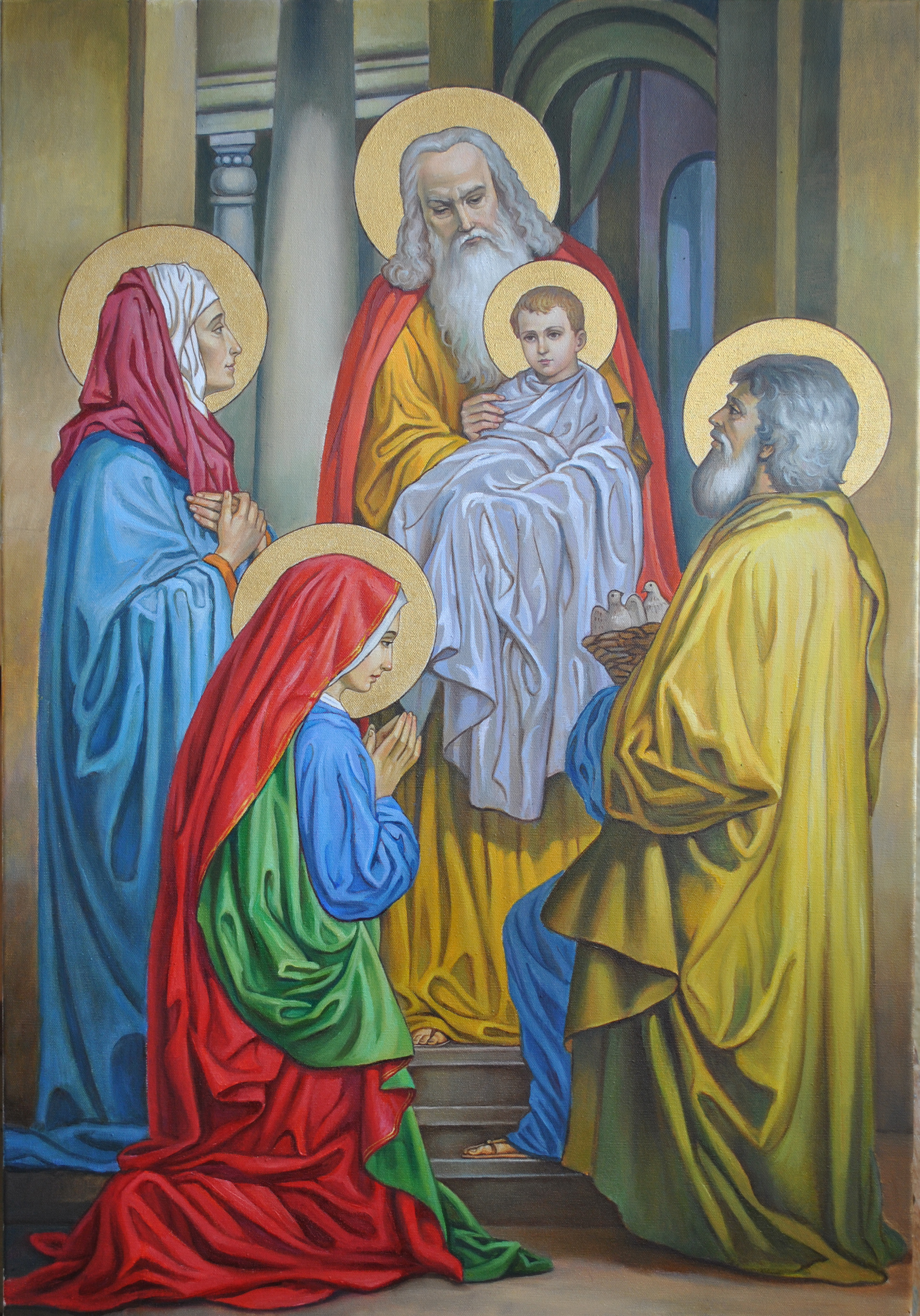 Это икона «Сретение Господне», выполненная мной зимой 2015. Она изображает принесение в церковь младенца Иисуса. Как пишет Википедия, «Сре́тение Госпо́дне, Принесение во Храм» это христианский праздник, посвященнный принесениею в Иерусалимский храм младенца Иисуса Христа его родителями, это состоялось на 40-й день после Рождества. В Иерусалимском Храме Святое Семейство встретил Симеон Богоприимец». Работа была выполнена для небольшой грекокатолической церкви по заказу тамошнего священника, о. Игоря. Это копия известной иконы, так что единственное, чем могу гордиться по этому поводу — это способностью долго и сосредоточенно работать.