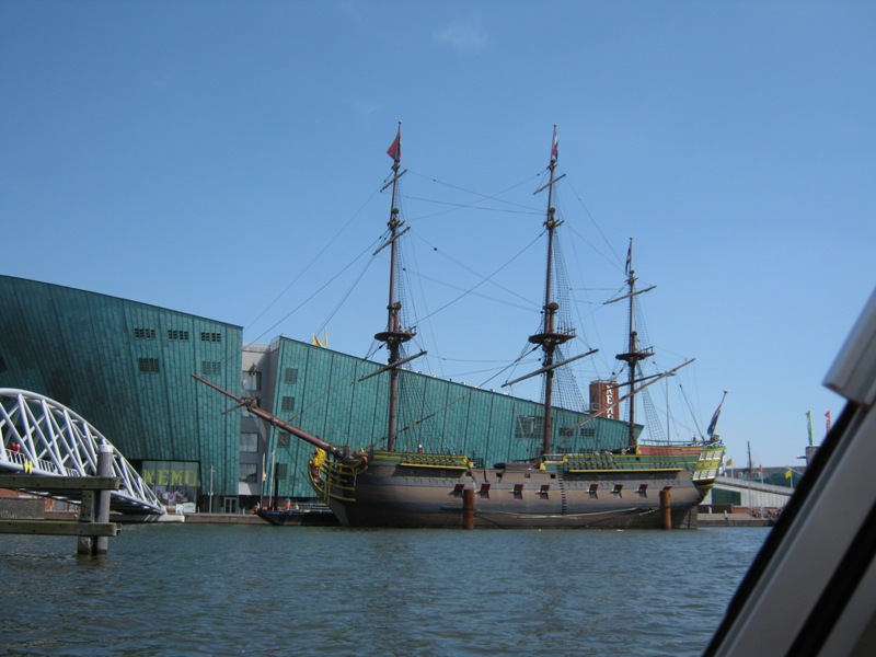 Корабль возле музея мореплавания в Амстердаме — напоминание о золотой эпохе Нидерландов.