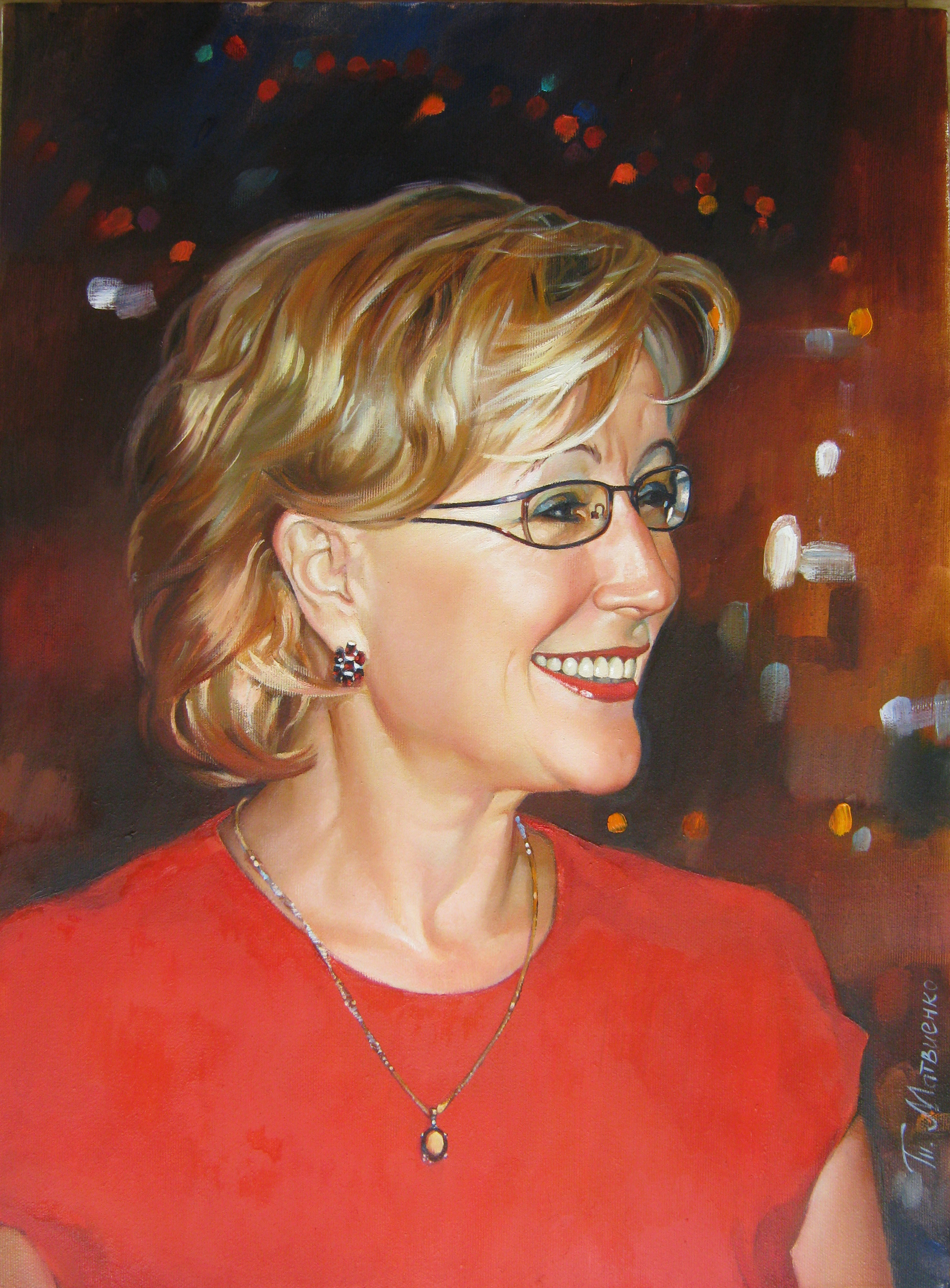 Портрет женщины в красном, это работа, выполненная на заказ. Сейчас она находится в Москве. Модель — улыбчивая, энергичная женщина средних лет. Чтобы сохранить баланс между точностью отражения и живописностью, удовлетворив при этом вкус заказчика, пришлось здорово постараться — Москва слезам не верит, как вы знаете 🙂 В любом случае, это хорошая работа, и думаю, мне есть чем гордиться.