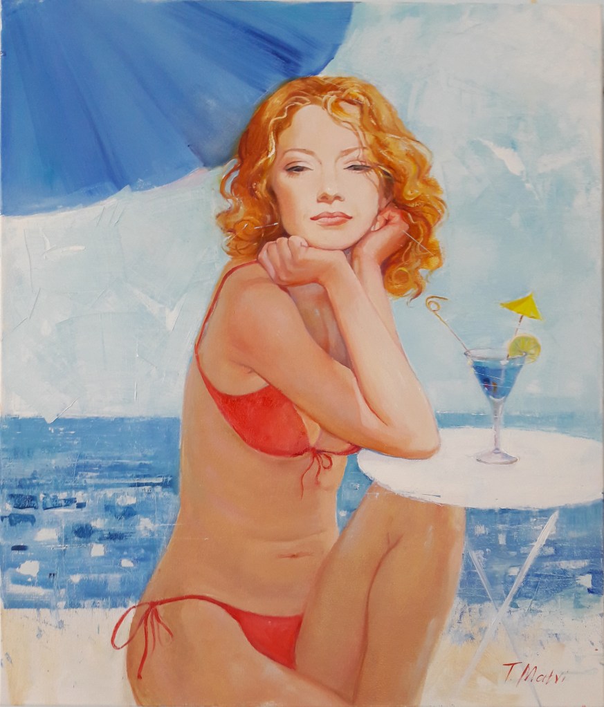 Работа навеяна моими впечатлениями об отдыхе на Красном море. Кто был в Шарм-аль-Шейхе, тот знает. Небо какого-то удивительного цвета, море, в котором обитают дивные рыбки фантастических расцветок, и томные вечера в ресторанах, где полураздетая публика негромко смеется, лениво попивая коктейли… Эту непостижимую атмосферу неги и вечного праздника не передать простыми словами, слова нужны какие-то другие, из иных, певучих языков не людей, а существ беззаботных, смешливых и ангельских. И лишь спустя годы ты понимаешь, что возможно, и сама была для кого-то таким вот томным, ангельским и желанным существом…